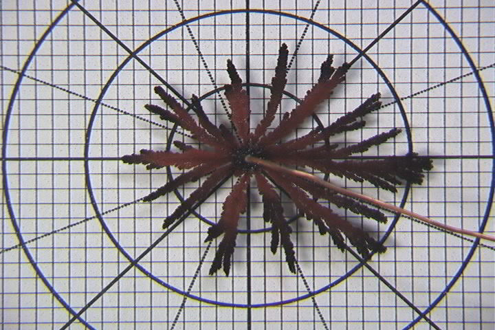 Also, the anisotropy of the copper is necessary for some types of patterns to occur. This is why it has been suggested to use a zinc-sulfate solution because its anisotropy is more pronounced. There have been studies using ZnSO4 where the types of patterns formed were grouped into four basic morphologies: DLA, dense radial, dendritic, and needle crystal [3]. If a plot is made of solution concentration versus voltage, it can be demonstrated that there are regions in the plot where only one type of pattern is realized and other regions which are transitional regions where two or more different types of patterns are noticed.