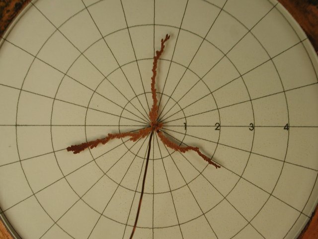 All the growths above were created from 0.3 M concentration of CuSO4. This time a magnetic field was applied by placing a magnet underneath the electrodeposition cell. The electric field causes the Cu++ atoms to have a velocity towards the center of the cell. These moving charges interact with the magnetic field causing a Lorentz force in the clockwise direction.