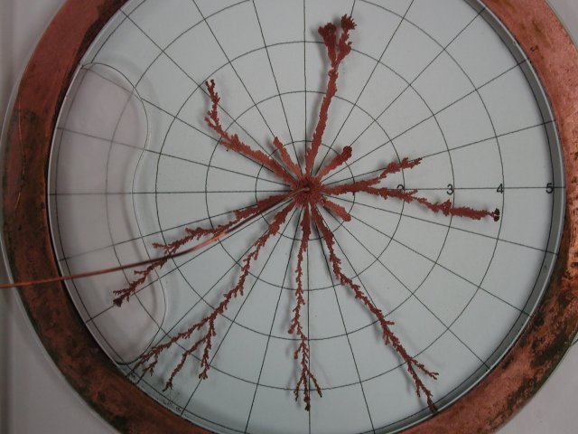 The copper ions drift towards the cathode and upon reaching the cluster are reduced and stick. At the beginning of this process, the atoms conglomerate in a bumpy fashion. The electric field is stronger on the bumps and thus the copper ions are more strongly attracted to them. As the bumps grow, the electric field at the tips grows. It is this interplay between the microscopic Cu atoms moving randomly about and the macroscopic electric field that causes the many patterns we see.