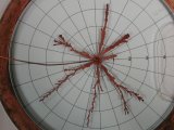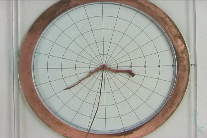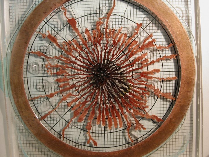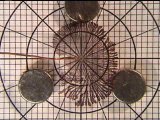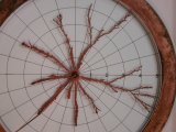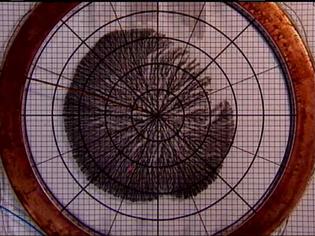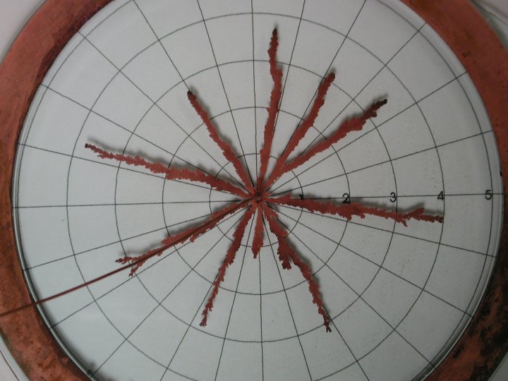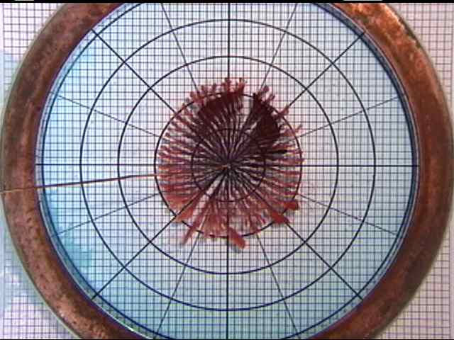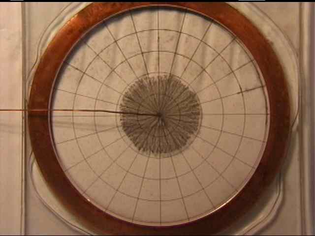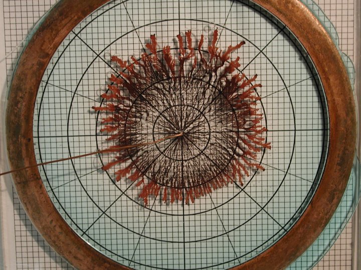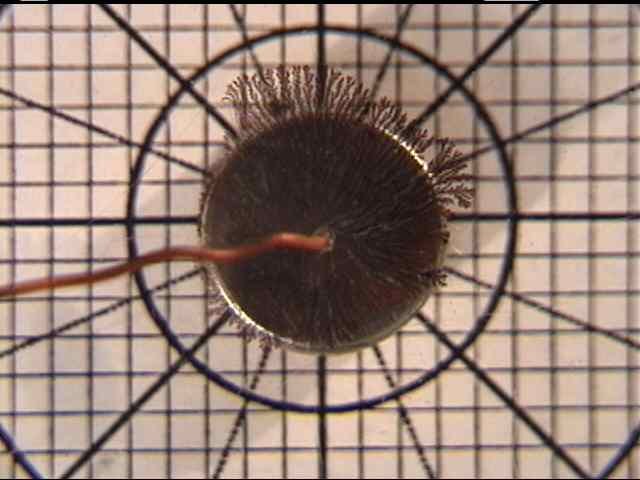 All the growths above were created from 0.3 M concentration of CuSO4. This time a magnetic field was applied by placing a magnet underneath the electrodeposition cell. The electric field causes the Cu++ atoms to have a velocity towards the center of the cell. These moving charges interact with the magnetic field causing a Lorentz force in the clockwise direction.