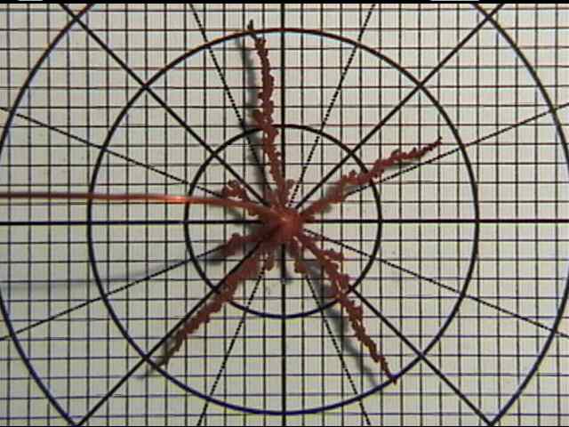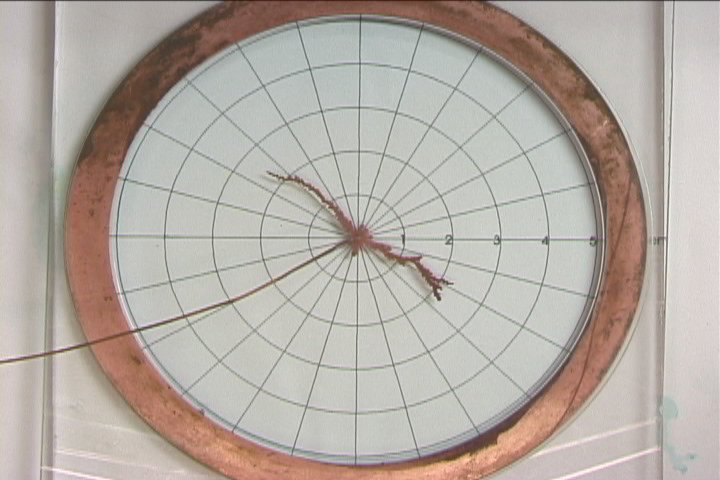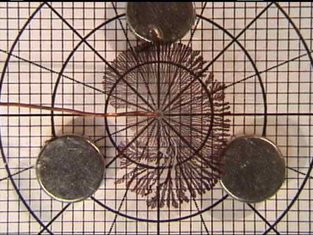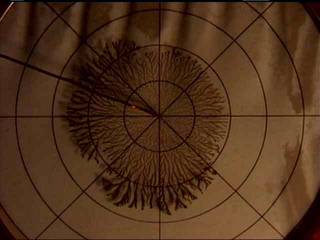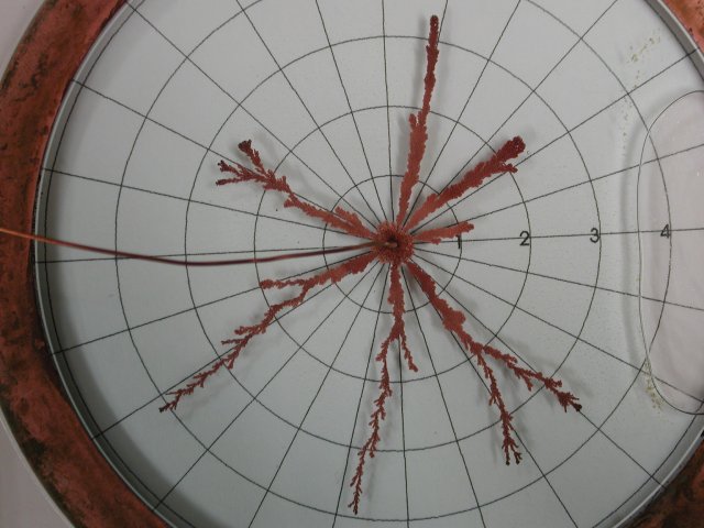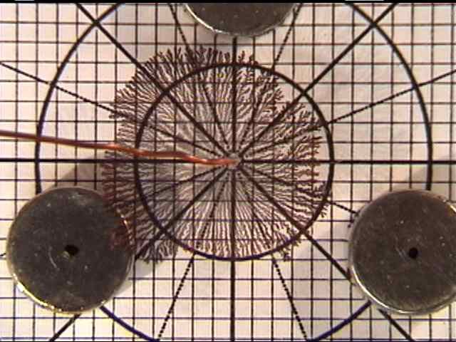 Also, the anisotropy of the copper is necessary for some types of patterns to occur. This is why it has been suggested to use a zinc-sulfate solution because its anisotropy is more pronounced. There have been studies using ZnSO4 where the types of patterns formed were grouped into four basic morphologies: DLA, dense radial, dendritic, and needle crystal [3]. If a plot is made of solution concentration versus voltage, it can be demonstrated that there are regions in the plot where only one type of pattern is realized and other regions which are transitional regions where two or more different types of patterns are noticed.