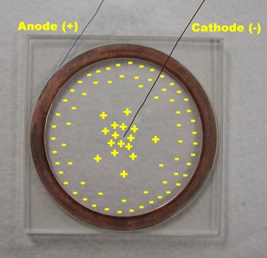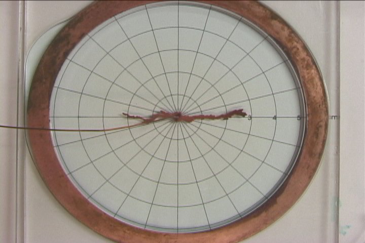 To start a simulation, you simply place the copper ring on the bottom Plexiglass plate and carefully pour the solution into the center of the ring. Then, carefully lay the grooved Plexiglass plate on top such that the copper ring fits into the groove. As mentioned above, it would probably be better to have the groove on the bottom plate and the drilled hole in the top plate. But our setup does work and once you have the top plate on, carefully insert the wire into the drilled hole.