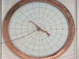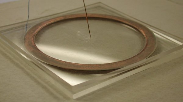 We used a lathe to etch a circular groove about 0.5 mm deep, centered on one of the Plexiglass plates. This groove is where the copper ring will sit and thus has the same inner and outer diameters. Since the groove is only 0.5 mm deep and the ring is 1 mm thick, when the ring is in the groove, it will protrude 0.5mm leaving a cavity where aqueous CuSO4 can be poured. This same plate had a small hole drilled in the center, just big enough for the un-insulated copper wire to be inserted. In hind-sight, it would have been better for the groove to be in one plate and the hole in the other in order to facilitate the setup of the experiment (see below).